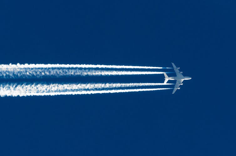 At high altitudes, contrails – the white lines we see in the sky – are formed in the wake of aircraft. These high altitude clouds are too thin to reflect much sunlight, but the ice crystals inside them can trap heat. Unlike the low-level cloud, which has a net cooling effect, contrails contribute significantly to global warming, effectively boosting the aviation industry’s share of greenhouse gas emissions to around 4.9%.