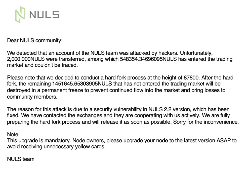 The NULS team confirmed the attack in a tweet posted this morning. In total, two million NULS ($480,000) were taken.