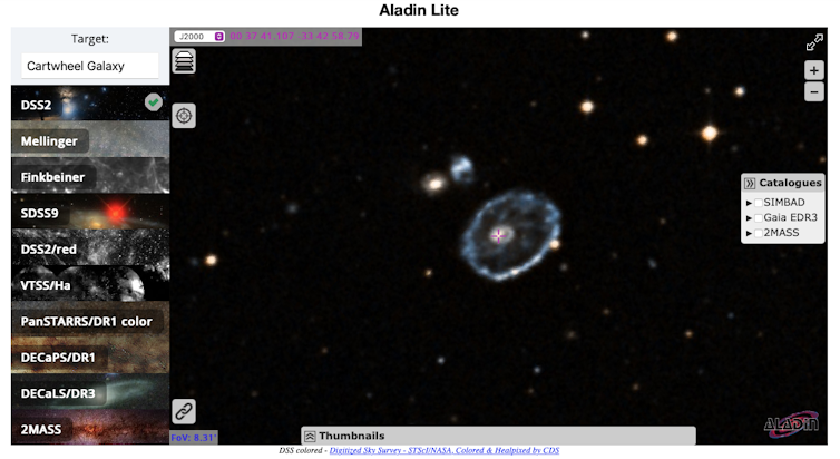 Let’s start our universal tour by searching for one of the most visually stunning galaxies out there, the Cartwheel Galaxy. In the Aladin interface, you can search for both the popular name of an object (like “cartwheel galaxy”) or known co-ordinates. The location will be centered in the interface.