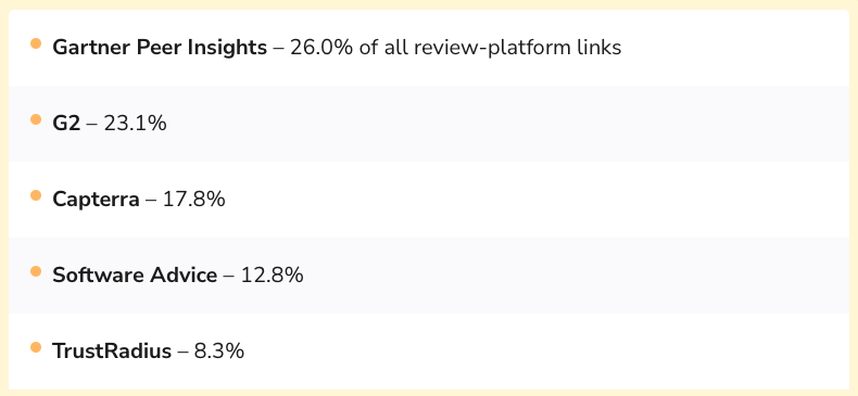 In terms of influence, independent industry analysis provides a clearer proxy than raw traffic or revenue. A study by SE Ranking measuring review-platform citation share in AI answers and search results found: