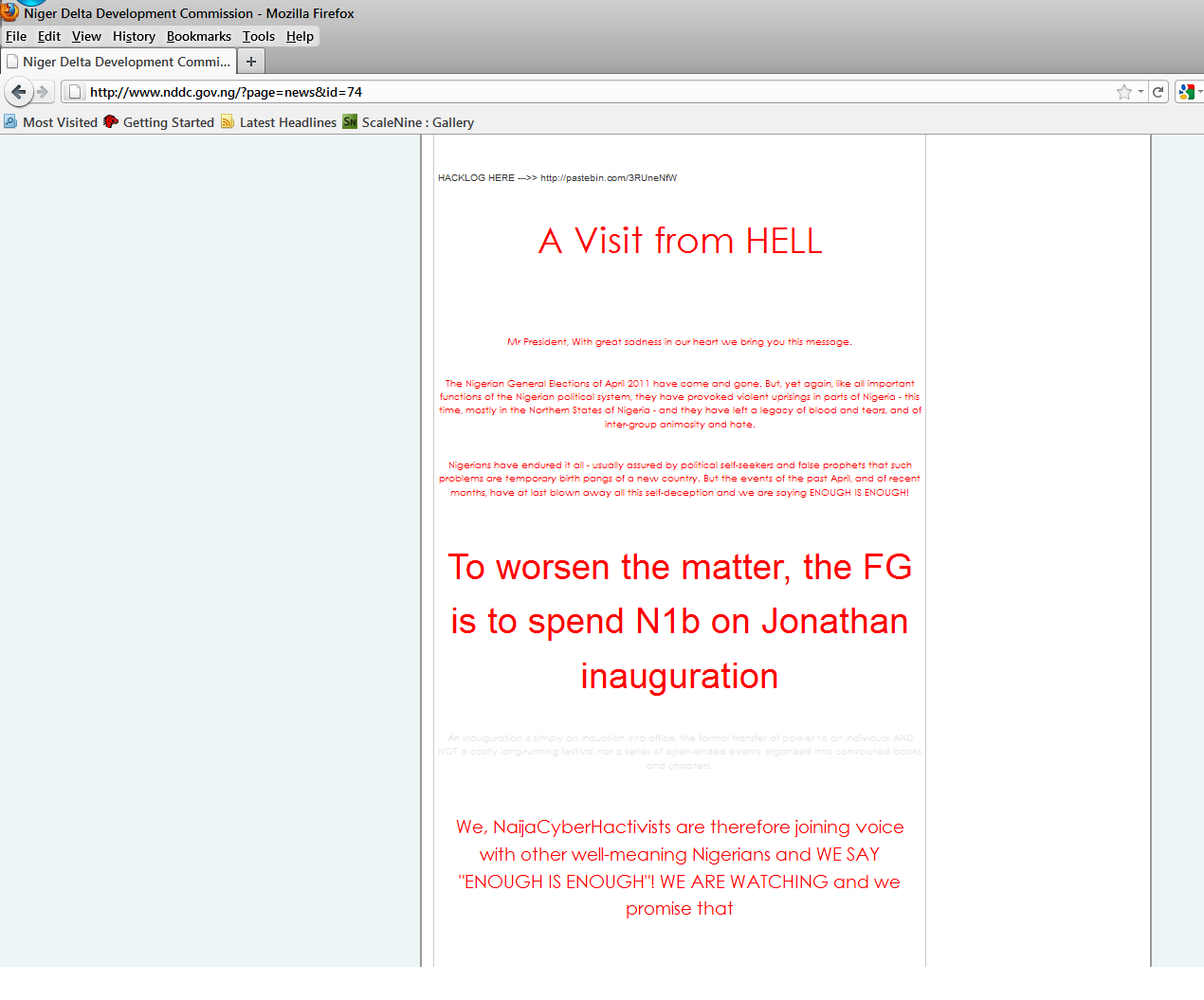 A group of Nigerian hackers who call themselves “Naija Cyber Hacktivists” broke into the Niger Delta Development Committee’s website, a Nigerian agency set up to develop the region, yesterday.