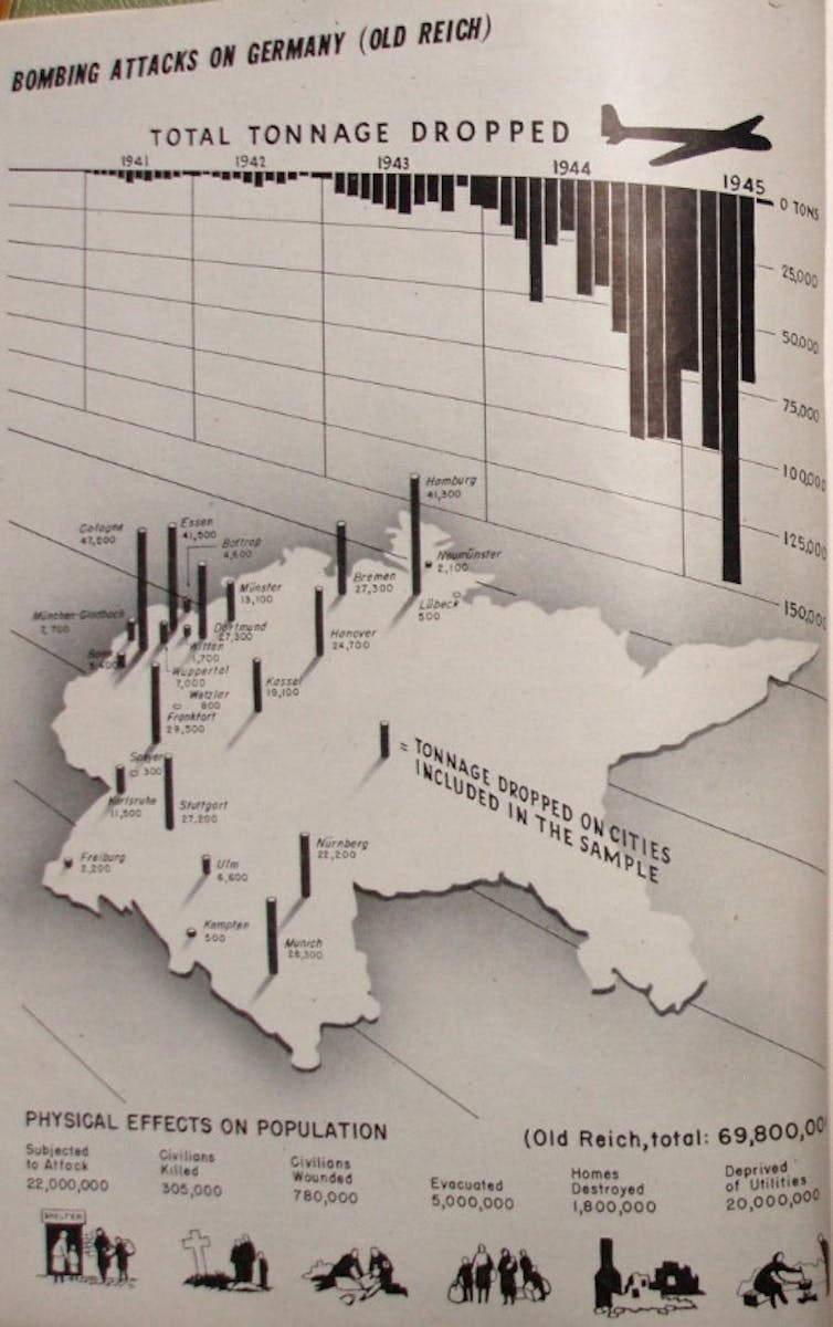 But most destructive energy still came from conventional weapons. Allied aircraft dropped over 2.75m tons of TNT, the equivalent of 185 Hiroshimas.