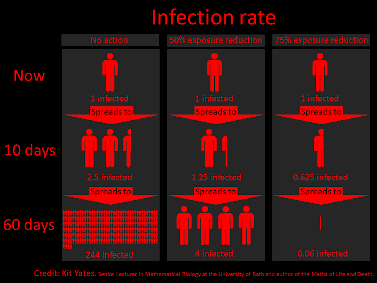 You may have seen a version of the infographic (below) that explains the potential impact of social distancing. It nicely illustrates that reducing the total number of disease-spreading contacts each infected person has can have a dramatic effect on the total number of infections a short time later. The numbers rely on the mathematical concept of “exponential growth”.