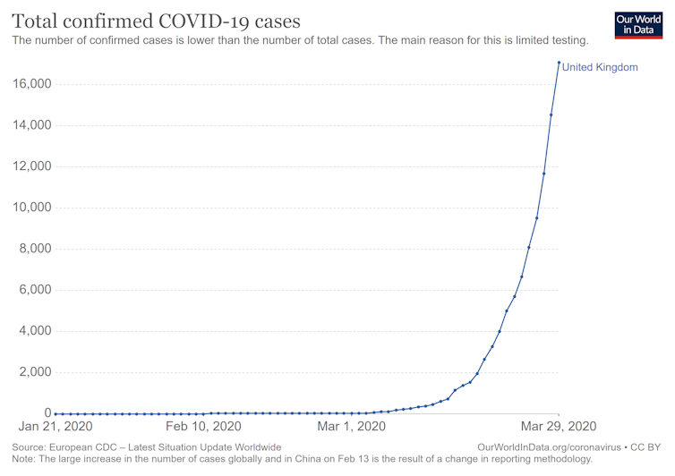 Recently, Boris Johnson, the British prime minister, told the press that “it looks as though we’re now approaching the fast growth part of the upward curve. And without drastic action, cases could double every five or six days”. The consistent doubling of cases in a fixed period is the hallmark of exponential growth.